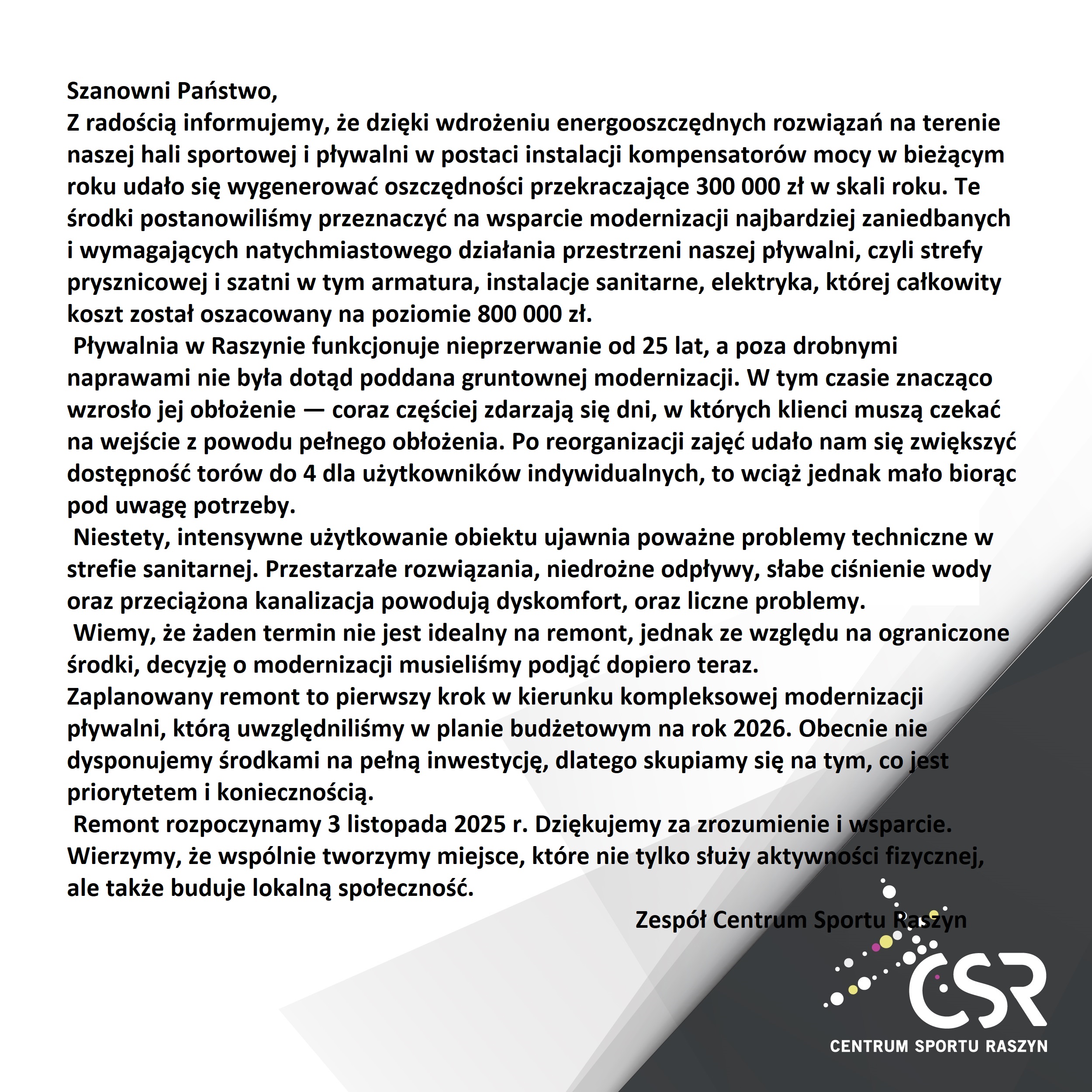 Drodzy klienci! | Centrum Sportu Raszyn