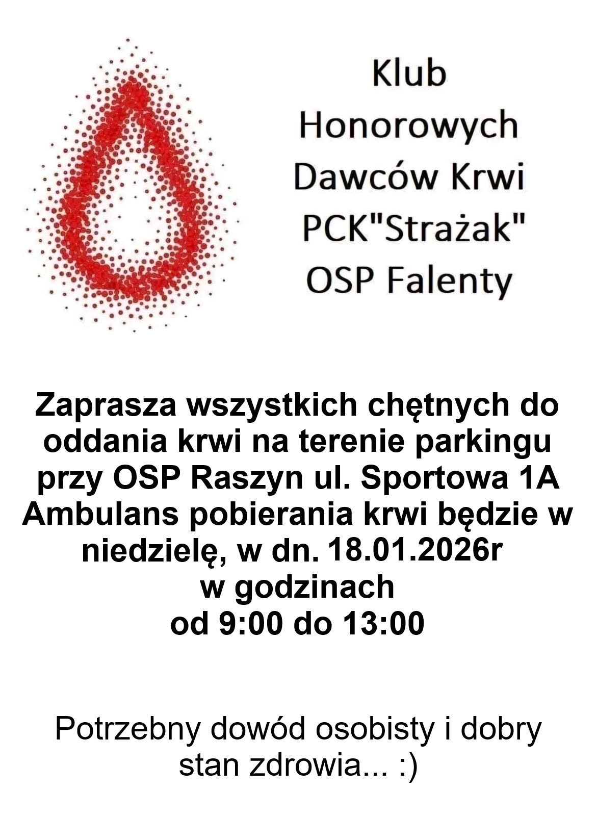Centrum Sportu Raszyn zaprasza do wzięcia udziału w akcji oddawania krwi, organizowanej przez Klub Honorowych Dawców Krwi PCK „Strażak” OSP Falenty. W dniu 18.01.2026 r. na terenie parkingu przy OSP Raszyn, ul. Sportowa 1A, w godzinach 9:00 - 13:00 będzie czekał ambulans pobierania krwi. Jeżeli Twój stan zdrowia jest dobry, to zabierz dowód osobisty, przyjdź i oddaj swoją krew. Możesz pomóc wielu ludziom, a nawet uratować czyjeś życie — zachęcamy!!!