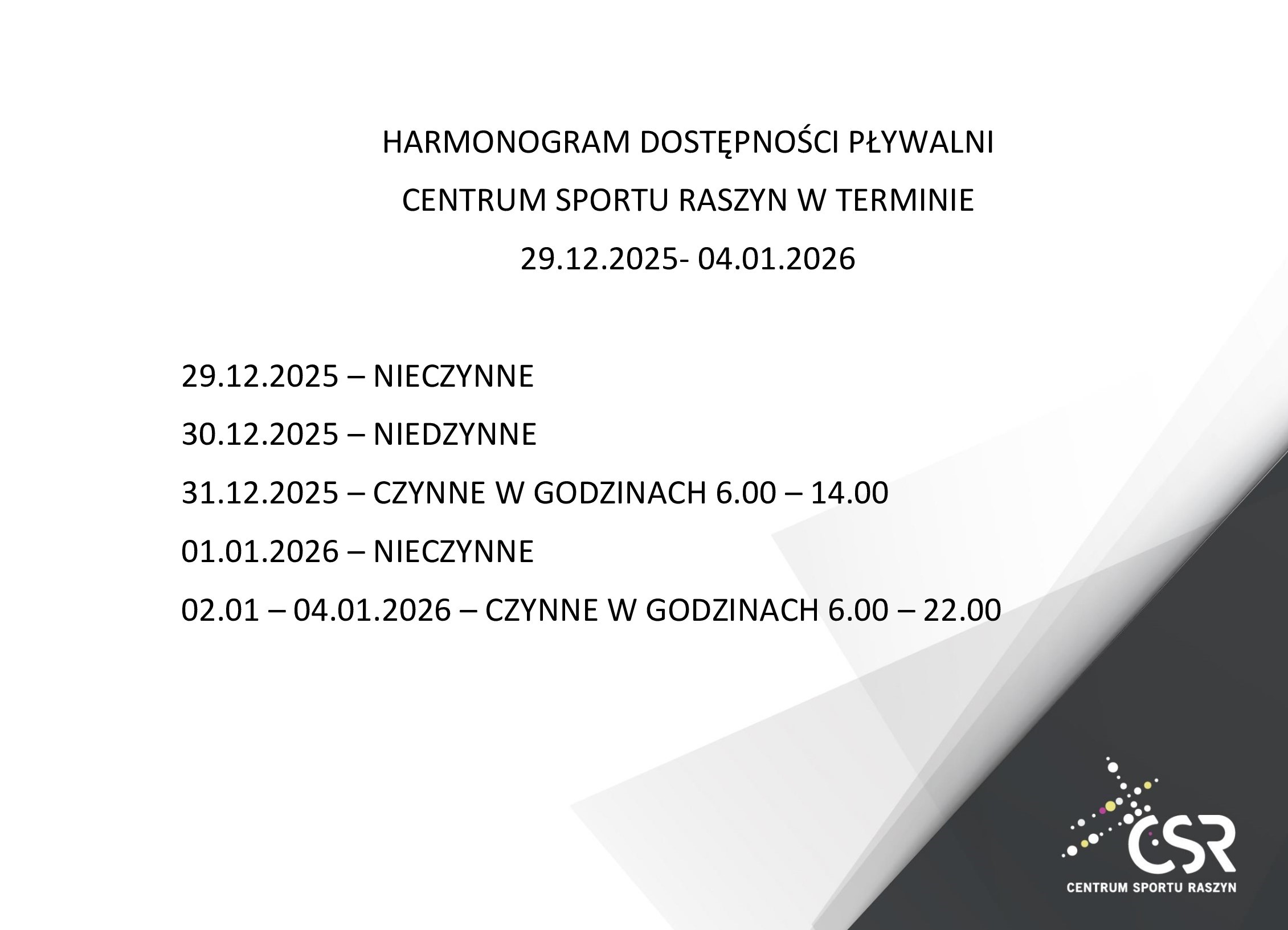 HARMONOGRAM PŁYWALNI W TERMINIE 29.12.2025 - 04.01.2026 | Centrum Sportu Raszyn