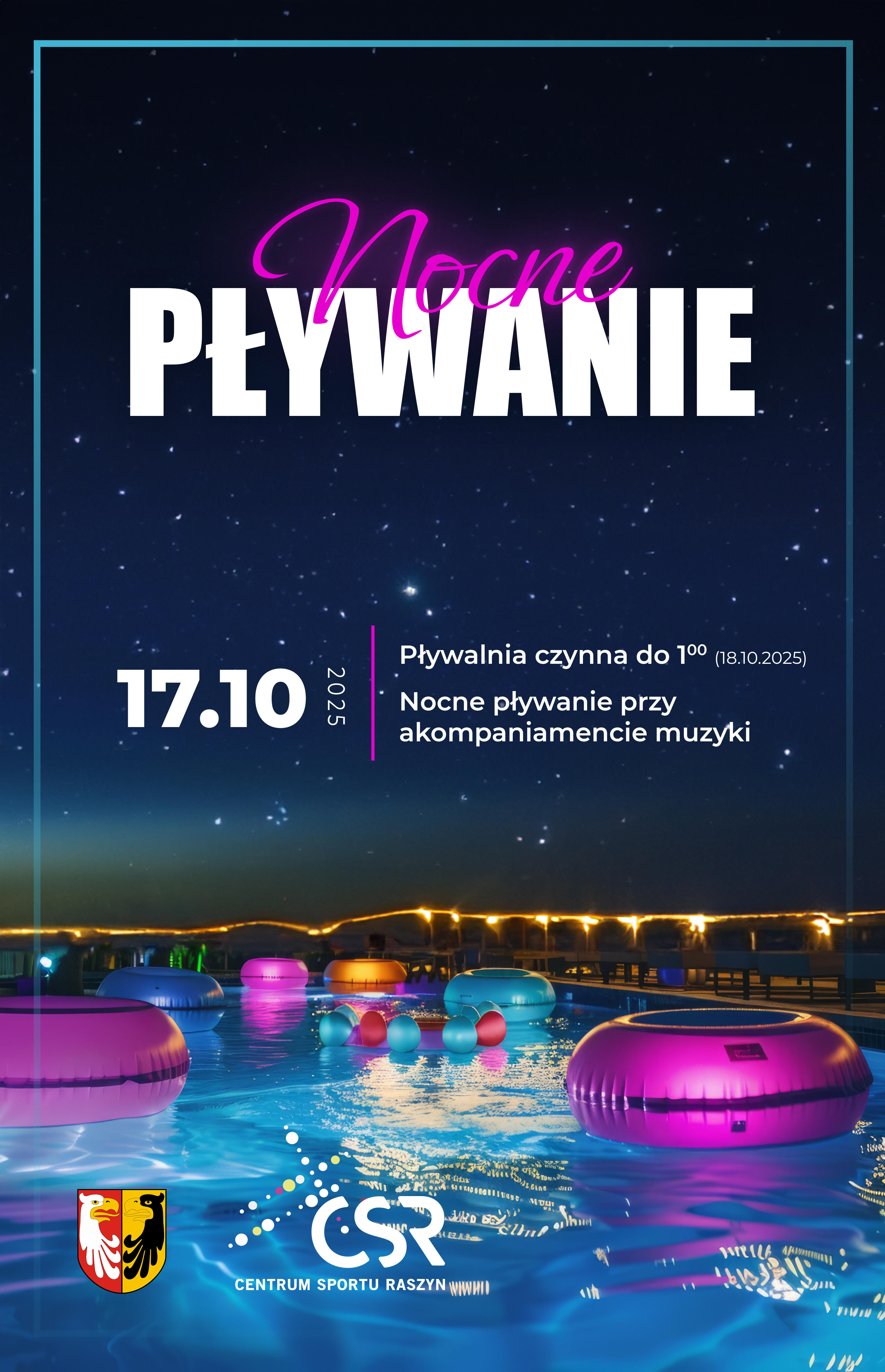 Już 17 października 2025 r. zapraszamy wszystkich miłośników relaksu i wodnych przygód na kolejną edycję nocnego pływania w Centrum Sportu Raszyn! ![]()