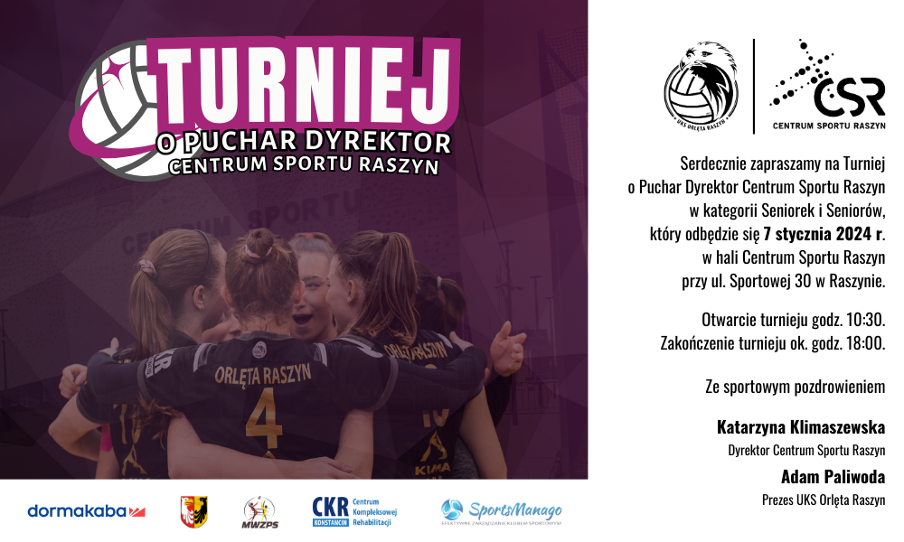 Prezes UKS Orlęta Raszyn oraz Dyrektor Centrum Sportu Raszyn zapraszają wszystkich kibiców na pierwszy turniej siatkarski w nowym roku — turniej o Puchar Dyrektor Centrum Sportu Raszyn. Wydarzenie odbędzie się 7 stycznia 2024 r. w hali sportowej CSR przy ulicy Sportowej 30. Otwarcie turnieju będzie miało miejsce o godzinie 10.30, a jego zakończenie planowane jest na godzinę 18.00. W zawodach udział wezmą cztery drużyny damskie oraz cztery męskie, a kibice będą mogli obejrzeć aż dwanaście spotkań, rozgrywanych równolegle na dwóch sektorach. Na siatkarskim parkiecie zobaczymy rywalizacje pomiędzy kobiecą reprezentacją UKS Orlęta Raszyn m.in. z reprezentantkami UKS Esperanto Warszawa oraz z KS AZS Warszawa. Mężczyźni grający w zespole UKS Orlęta Raszyn, podczas turnieju, staną naprzeciw drużyn takich jak: GLKS Nadarzyn, SPS Konstancin-Jeziorna Seniorzy oraz UKS Olimpijczyk 2008 Mszczonów. Kibice, którzy przyjdą obejrzeć ten turniej, będą świadkami siatkarskiej rywalizacji na wysokim sportowym poziomie i będąc częścią turnieju, poczują prawdziwe sportowe emocje. Serdecznie zapraszamy i zachęcamy do wspierania swoich ulubionych drużyn podczas Turnieju o Puchar Dyrektor Centrum Sportu Raszyn.