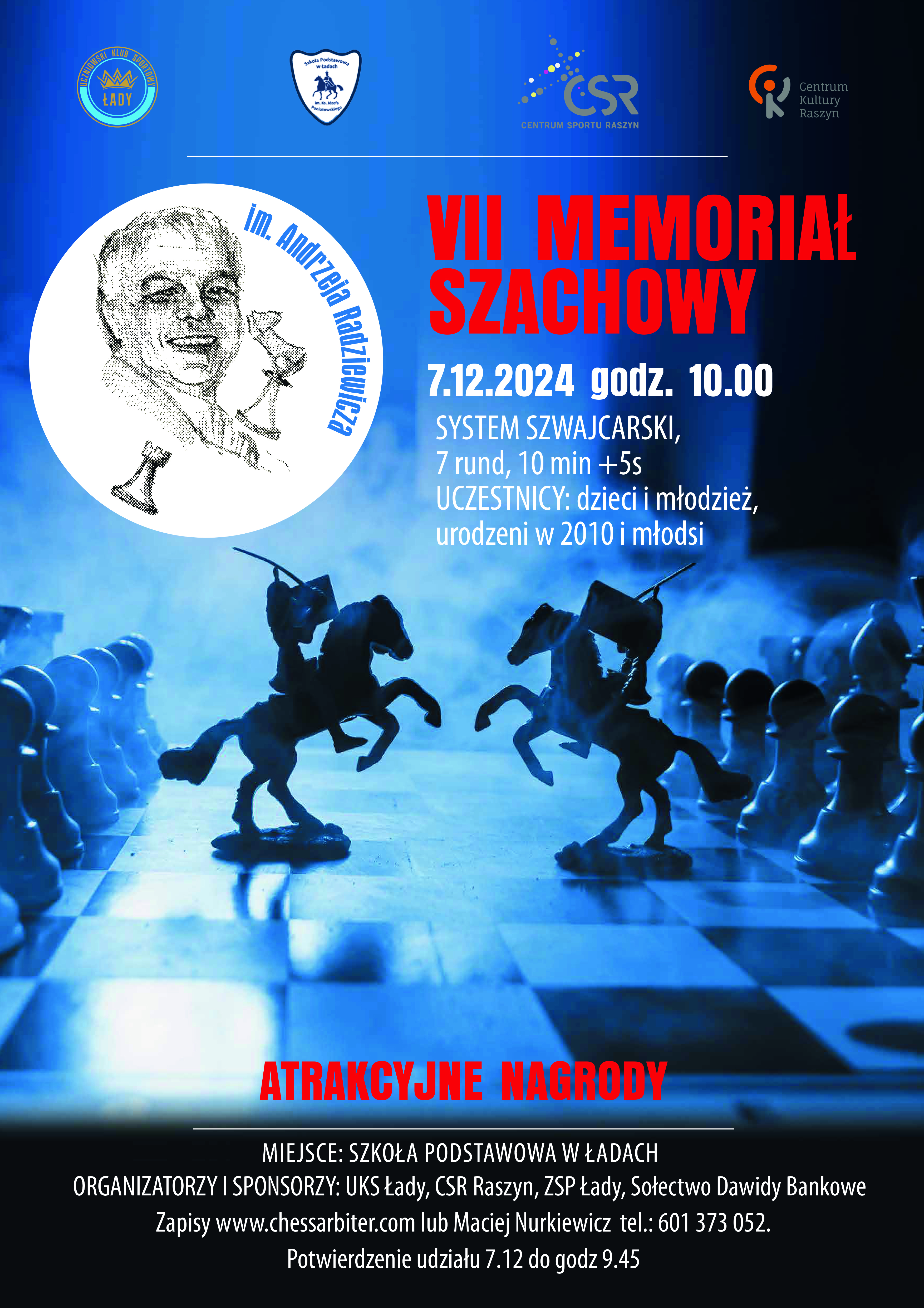 Centrum Sportu Raszyn zaprasza na VII Memoriał Szachowy im. Andrzeja Radziewicza, który odbędzie się 7 grudnia 2024 r. w szkole podstawowej w Ładach. Do rywalizacji w tym wyjątkowym wydarzeniu dopuszczona jest młodzież i dzieci z rocznika 2010 r. oraz młodsi. Memoriał upamiętnia nauczyciela i współzałożyciela sekcji szachowej w UKS Łady — pana Andrzeja Radziewicza, ale też jest w naszej gminie dużym wydarzeniem szachowo-integracyjnym. Wraz z innymi organizatorami i sponsorami zachęcamy do zapisów, a także do wspierania zawodników podczas wydarzenia.