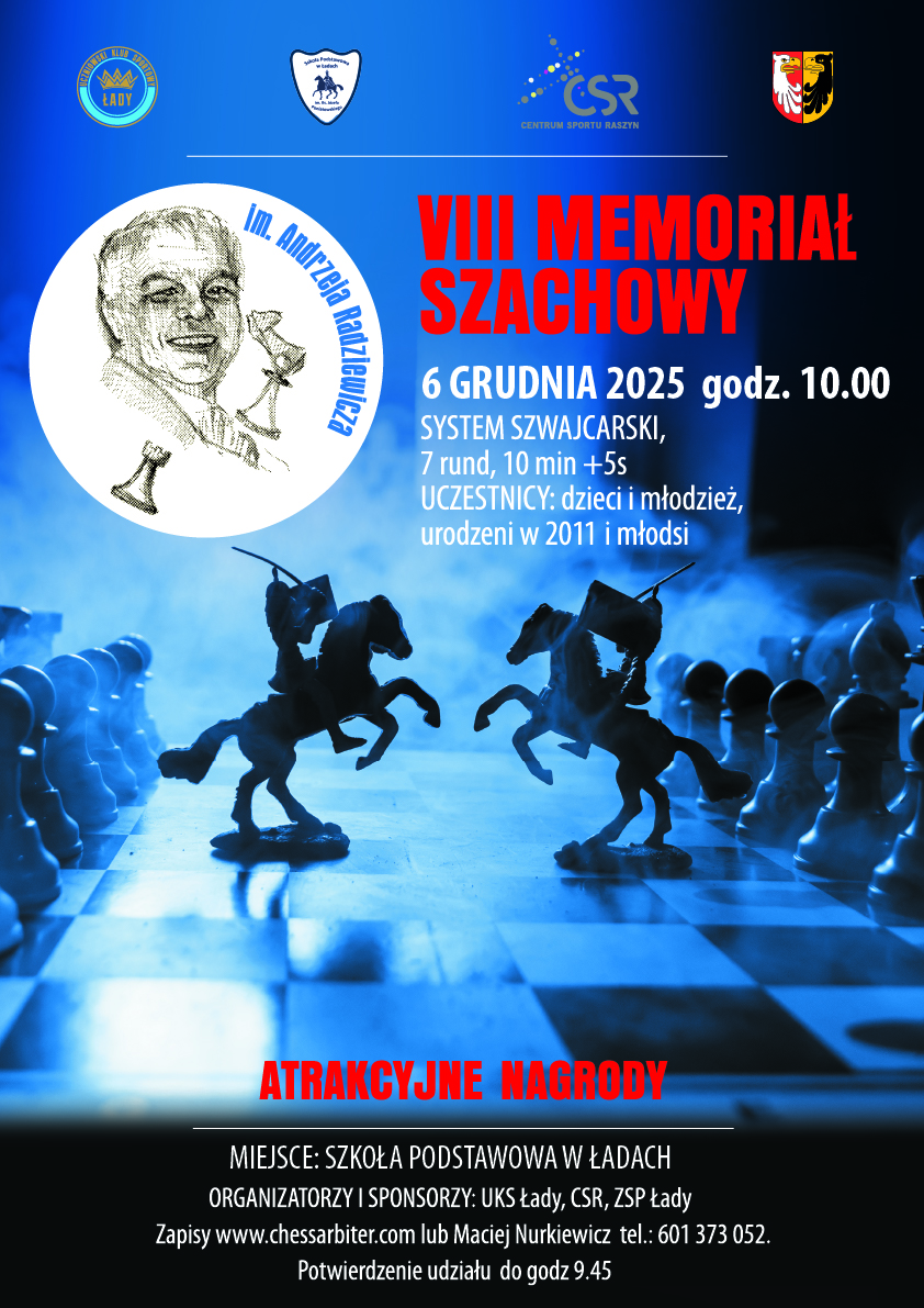 Już 6 grudnia 2025 r. w Szkole Podstawowej w Ładach odbędzie się kolejna edycja wyjątkowego wydarzenia – VIII Memoriał Szachowy im. Andrzeja Radziewicza. To doskonała okazja, by spróbować swoich sił przy szachownicy, zdobyć nowe doświadczenia i spędzić Mikołajki w atmosferze sportowej rywalizacji oraz dobrej zabawy. Turniej rozgrywany będzie systemem szwajcarskim, a dla zwycięzców przygotowane zostaną nagrody. Serdecznie zachęcamy do zapisów!